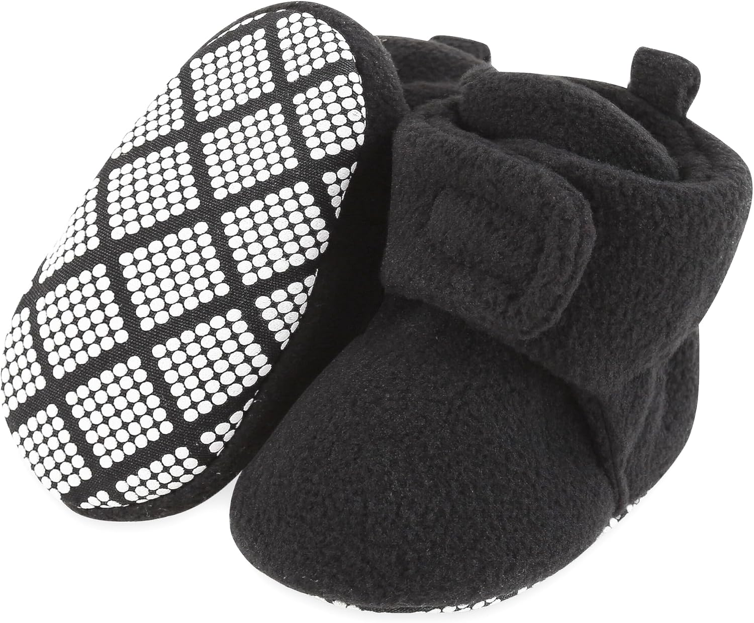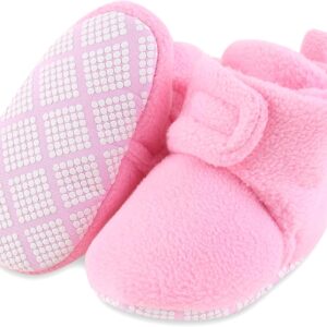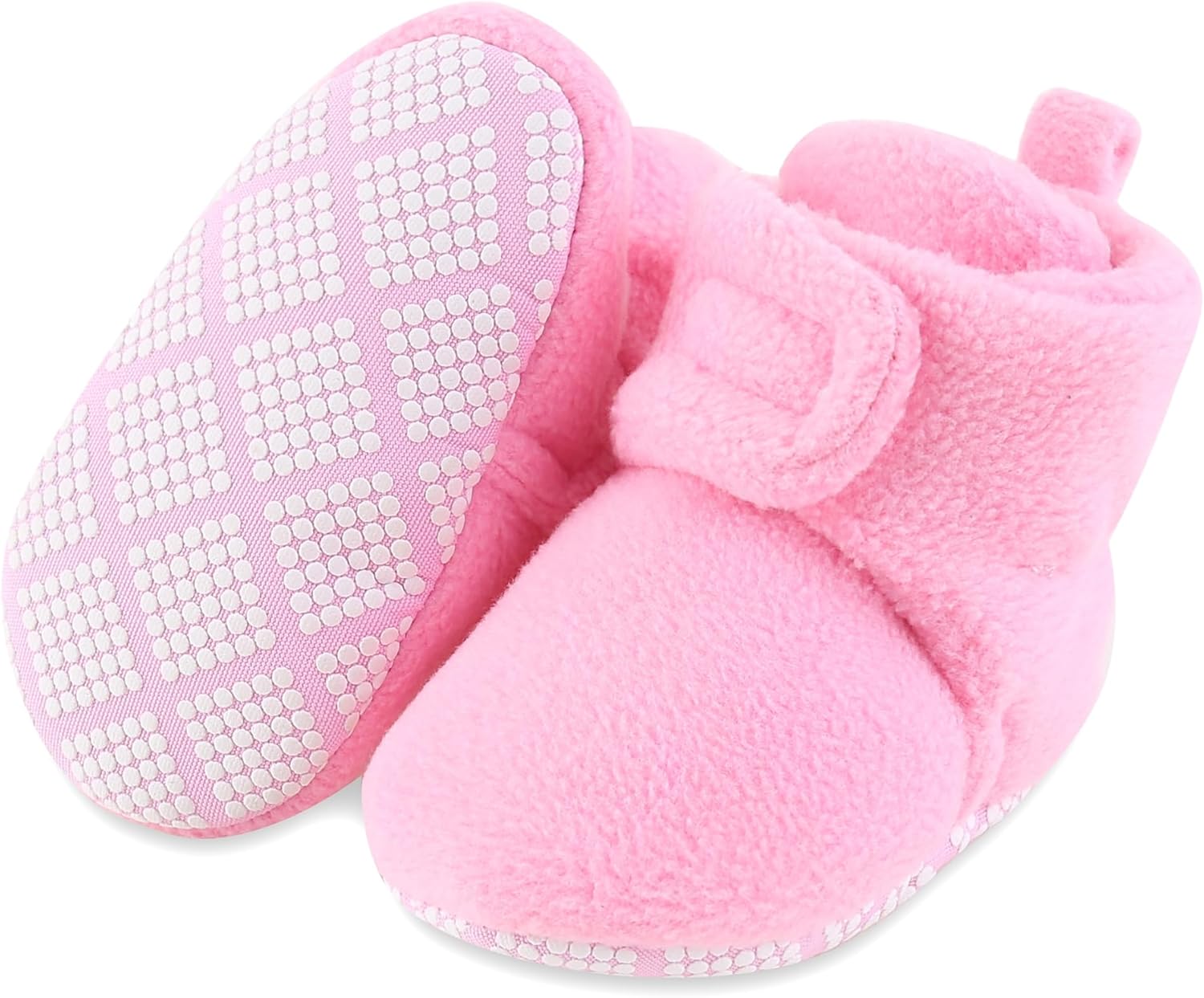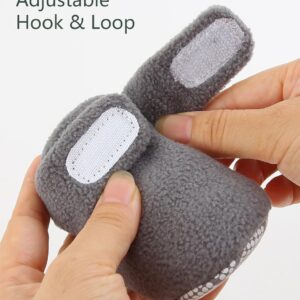 These cozy gray baby booties are designed for comfort and warmth, making them an excellent choice for newborns and infants. Crafted from a soft, fleece-like material, they provide a gentle embrace for tiny feet. The booties feature a practical non-slip sole, adorned with a pattern of white dots, offering secure footing for early walkers or during playtime on smooth surfaces. Their high-top design ensures they stay put, keeping little ankles snug. Ideal for cooler weather, these booties are a versatile accessory for everyday wear, providing both comfort and a touch of style for any baby.