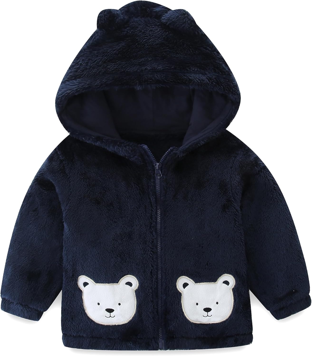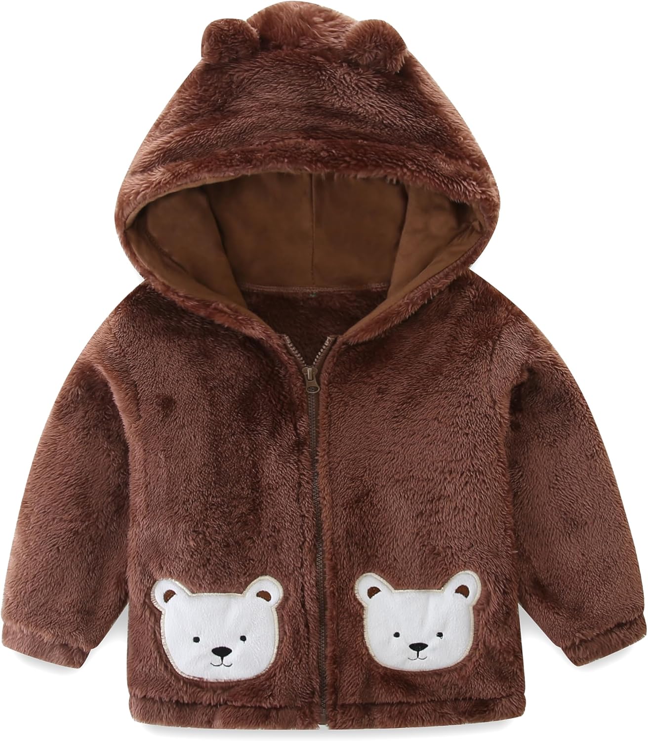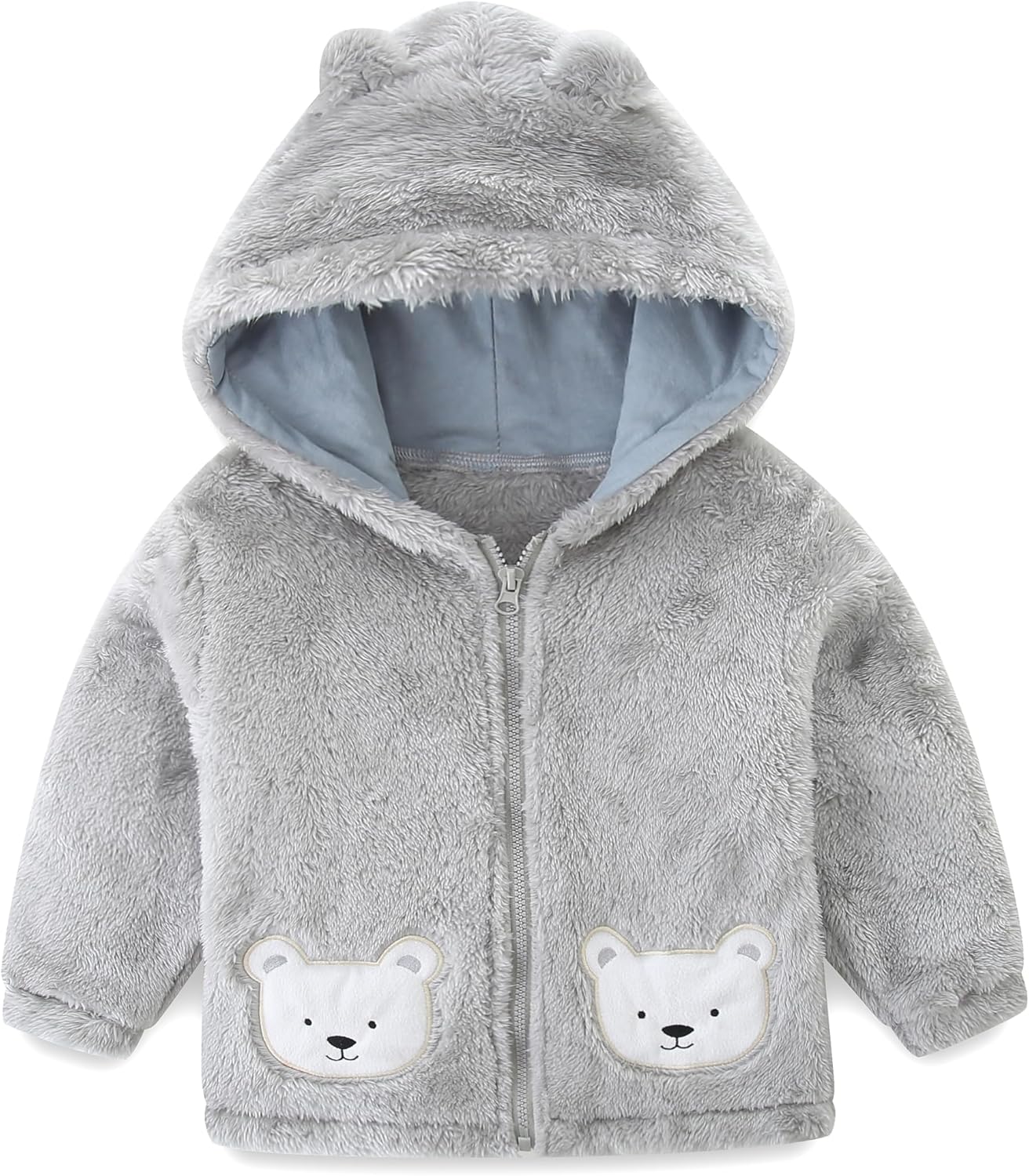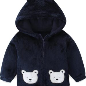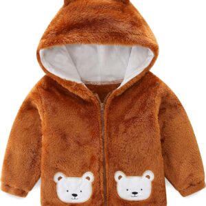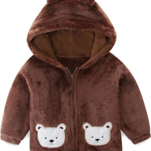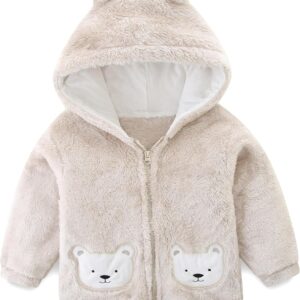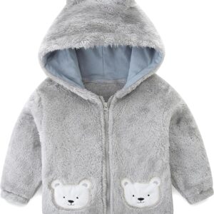 This adorable pink fuzzy toddler jacket is designed to keep little ones warm and cozy. It features a soft, plush texture throughout, making it comfortable for everyday wear. The jacket includes a hood with cute bear ears and a full-length pink zipper for easy dressing. Two charming bear face pockets are stitched onto the front, adding a playful touch. This outerwear is ideal for cooler weather, providing warmth for babies and young children during their outdoor adventures or simply for comfort indoors. Its inviting design makes it a delightful addition to any toddler’s wardrobe.