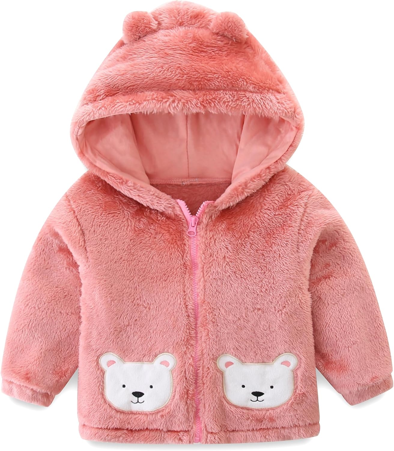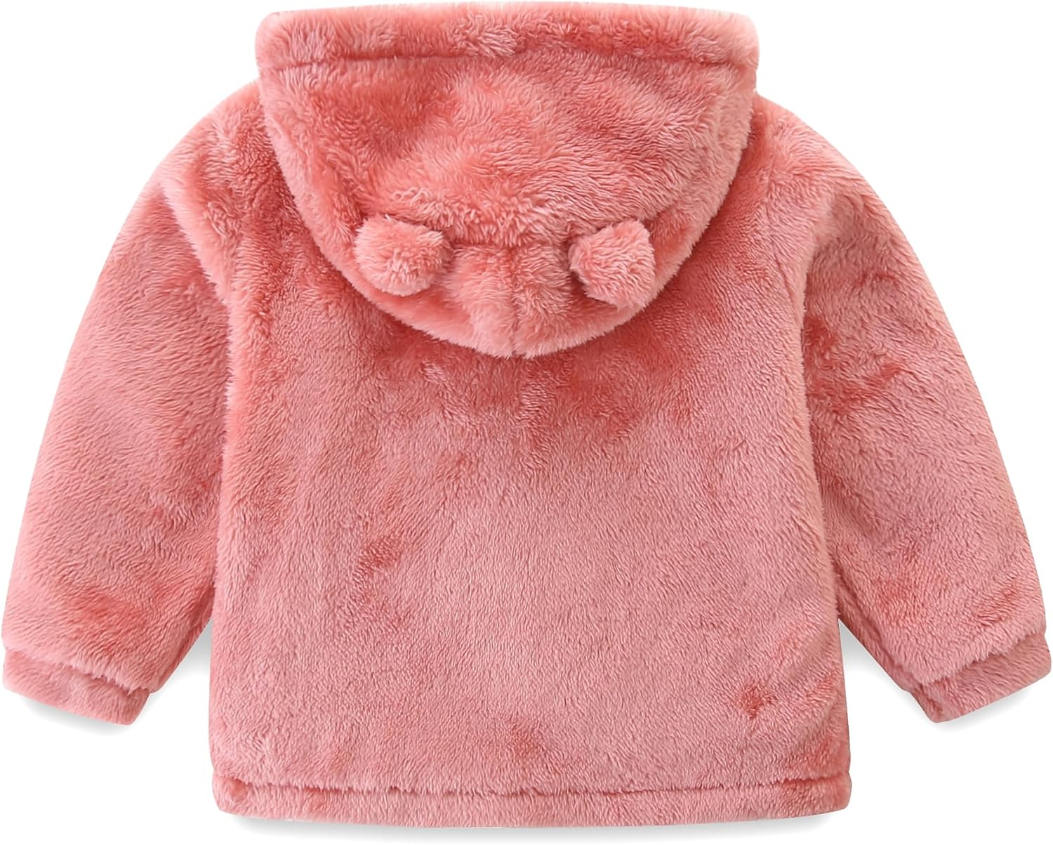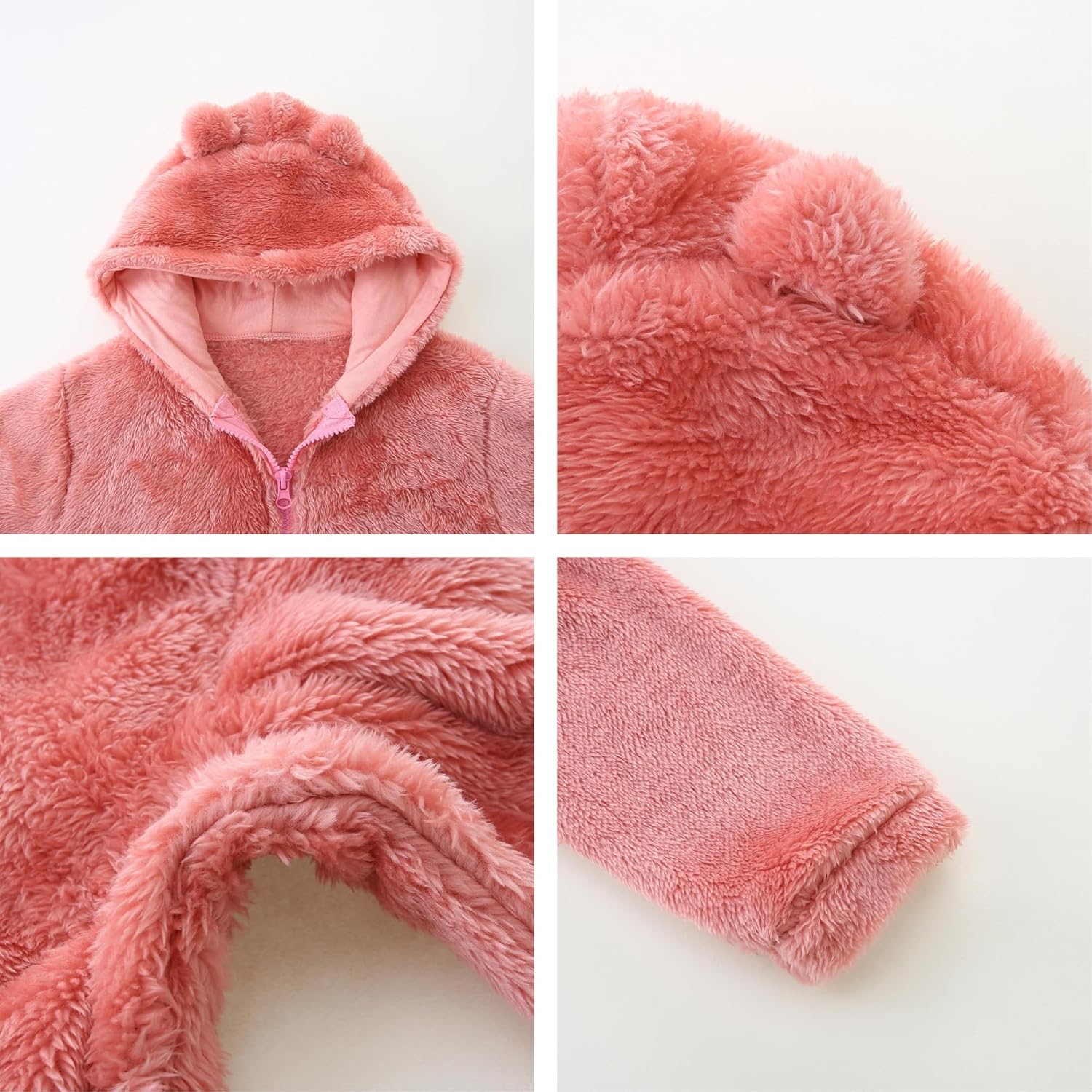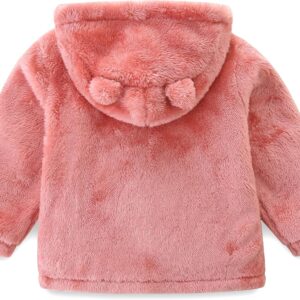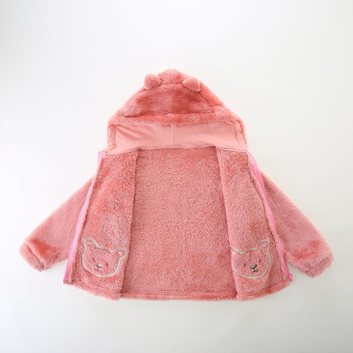 Pink Fuzzy Hooded Toddler Jacket with Bear Ears and Pockets